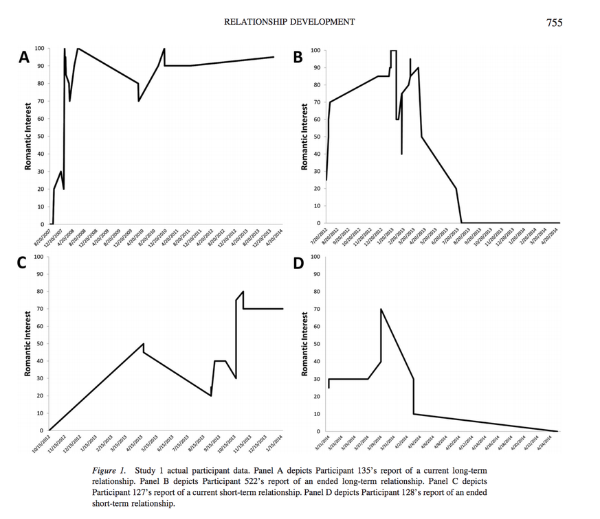 Insgesamt haben innerhalb der Studie 800 Menschen ihre vergangenen Beziehungen rekonstruiert: Vom Kennenlernen über den ersten Sex bis hin zur Trennung. Daraus zeichneten die Forschenden verschiedene Verlaufskurven. Eine zeigt das An- und Absteigen des sexuellen Begehrens, eine andere dokumentiert die Intensität von Fürsorge und zwei weitere zeigen den Verlauf von Selbstvermarktung und romantischem Interesse auf.